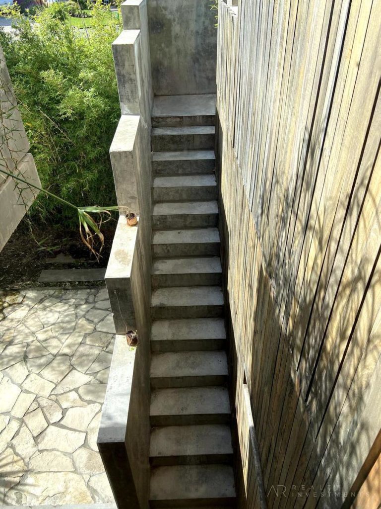 En planta baja, la entrada a la casa es a través de un espacio verde tupido de plantas con mesa y sillas a la sombra.