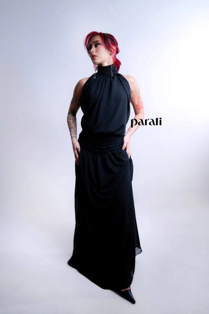 Look 1: Vestido negro @lalapontoficial, aros (@venusfactory)