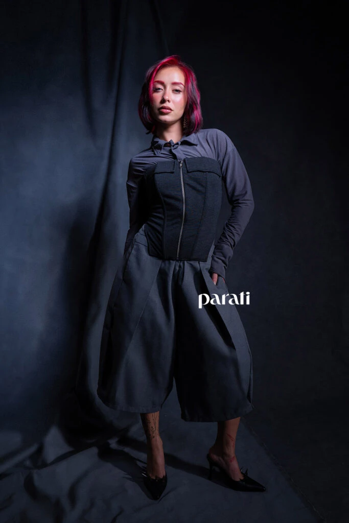 Look 2: Pantalón gris, corset y remera con cuello (@mija_ba) y zapatos (@rickysarkany).