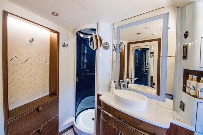 La madera de nogal es el detalle más vistoso en el mobiliario según describe el libro. "Los sillones que se reclinan totalmente son de cuero y tienen almohadones con motivos holandeses, como canales, molinos de viento y tulipanes, y el baño es del tamaño de una habitación y trae una ducha incorporada".
