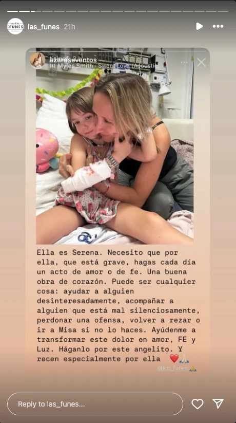 Frente a esta dura realidad, su familia –liderada con amor y coraje por su mamá, Titi Funes– decidió hacer lo único que saben hacer cuando el dolor desborda: abrir el corazón y multiplicar la fe. Así nació una cadena de oración que no deja de crecer, uniendo personas que quizás no conocen a Serena, pero que se sienten profundamente conmovidas por su historia.