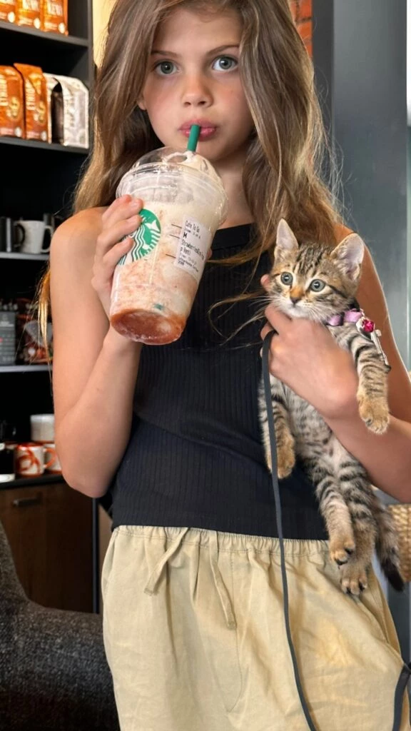 La esposa de Icardi se fotografió desde un local de Starbucks tomando un milkshake y junto a Benedicto, Constantino, Isabella y Francesca, esta última llevando una pequeña gata que tenía puesto un collar rosa con cascabel.