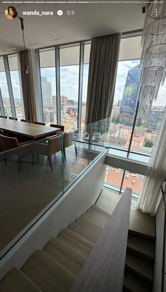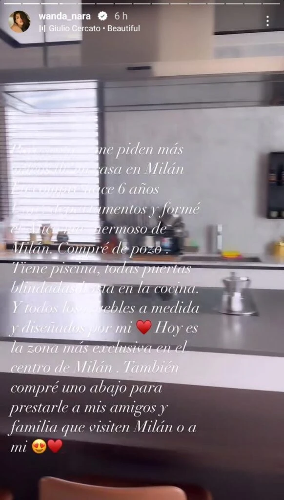 "Para los que me piden más videos de mi casa en Milán. La compré seis años. Uní 4 departamentos y formé el ático más hermoso de Milán. Compré de pozo. Tiene piscina, todas las puertas blindadas hasta en la cocina", reveló Wanda.
