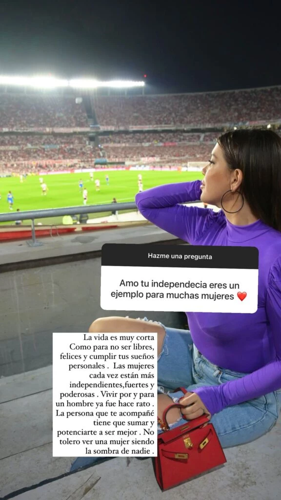"La vida es muy corta como para no ser libres, felices y no cumplir tus sueños. Las mujeres cada vez están más fuertes, independientes y poderosas. Vivir por y para un hombre ya fue hace rato. La persona que te acompañe tiene que sumarte y potenciarte a ser mejor. No tolero ver a una mujer ser la sombra de nadie", escribió, vía Stories.
