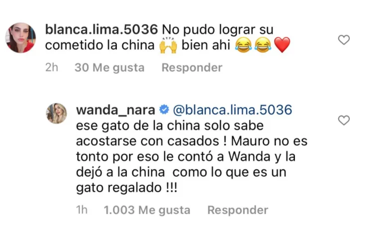 Todo comenzó cuando, en un posteo de Wanda, aparecieron comentarios realizados desde su propia cuenta: “¡Ese gato de la China solo sabe acostarse con casados! Mauro no es tonto, por eso le contó a Wanda y la dejó a la China como lo que es, un gato regalado”, “En París se sacó la bombachita y a su casa se volvió solita”, “Icardi ama mi cuerpo en su cama” y “La más putarraquita soy yo”, fueron algunas de las polémicas frases.