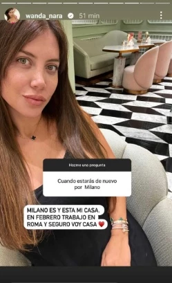 Por otro lado, la empresaria adelantó que, muy pronto, estará en Italia por temas laborales. "Milano es y está mi casa. En febrero trabajo en Roma y seguro voy casa", escribió. Mientras tanto, se espera que Nara cierre contrato con Telefé para la conducción de un programa de entretenimientos y/o ciclo de entrevistas.