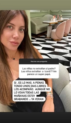 "¿Las niñas ya no extrañan al padre?¿Los niños extrañan a Icardi? Me parece un súper papá", le preguntaron vía redes. A lo que Nara no tardó en contestar: “Sí, es lo más. Apenas tenga unos días libres los acompaño. Aunque no lo vean todas las mañana, estoy grabando. Ya verán", expresó sobre el delantero del Galatasaray.