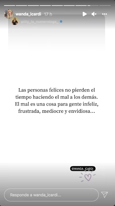 "Las personas felices no pierden el tiempo haciendo el mal a los demás. El mal es una cosa para gente infeliz, frustrada, mediocre y envidiosa", fue la frase que Pitty publicó y que Wanda posteó en su cuenta.