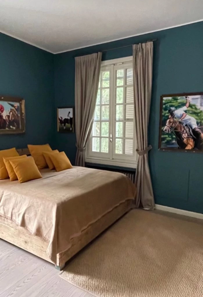 En la habitación de huéspedes no hay mayores lujos y se puede decir que los colores están en el tope de la atención: en este caso eligió un verde que combinó con la gama de tonos cálidos para el piso de vinilo y los detalles de decoración de la cama. Los cuadros tienen fotos de caballos de polo.
