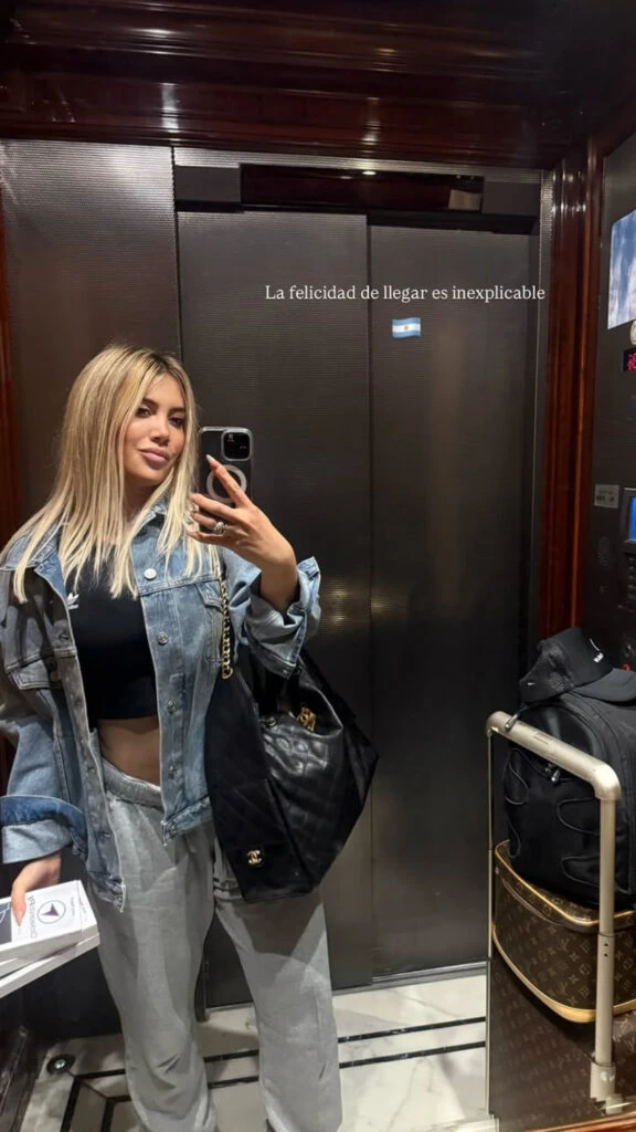 También publicó una selfie frente al espejo en el ascensor, luciendo un look relajado compuesto por un top negro, campera de jean, jogger gris y bolso negro. “La felicidad de llegar es inexplicable”, expresó junto a la imagen, en la que se notaban las valijas a su lado.