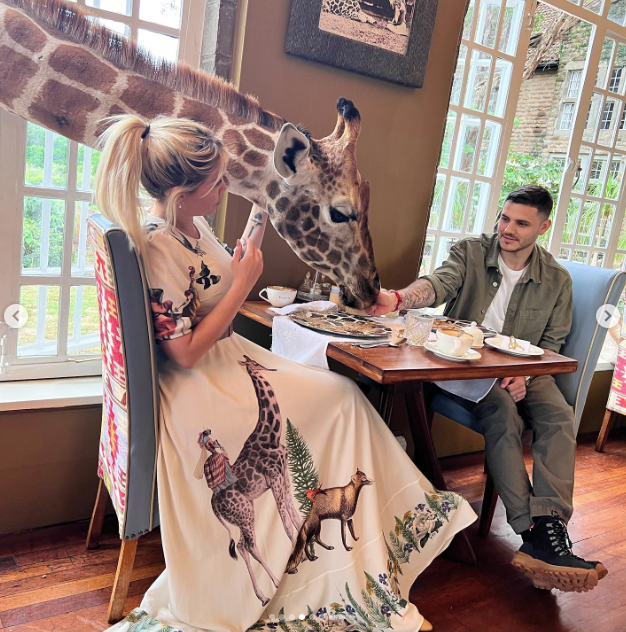 Mientras Mauro y Wanda -lookeada con un vestido con estampas alusivas- tomaban su desayuno, una jirafa se sumó a ellos ingresando su cabeza por la ventana (quizás buscando que la conviden con algo).