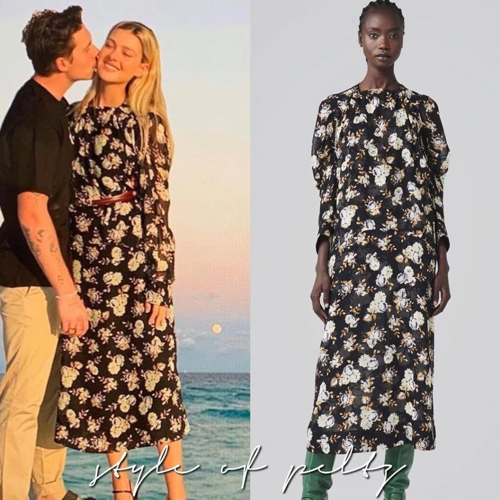 Uno de los vestidos que llevó Nicola tiene mangas largas y estampa de rosas blancas, azules y verdes sobre fondo negro. Pertenece a la nueva colección Pre otoño/invierno 2021 de Victoria Beckham y puede comprarse por 1.650 euros. La modelo lo llevó con un cinturón de cuero marrón con dos cisnes dorados, también de la firma de su suegra (350 euros), y una sandalias con pulsera al tobillo negras.