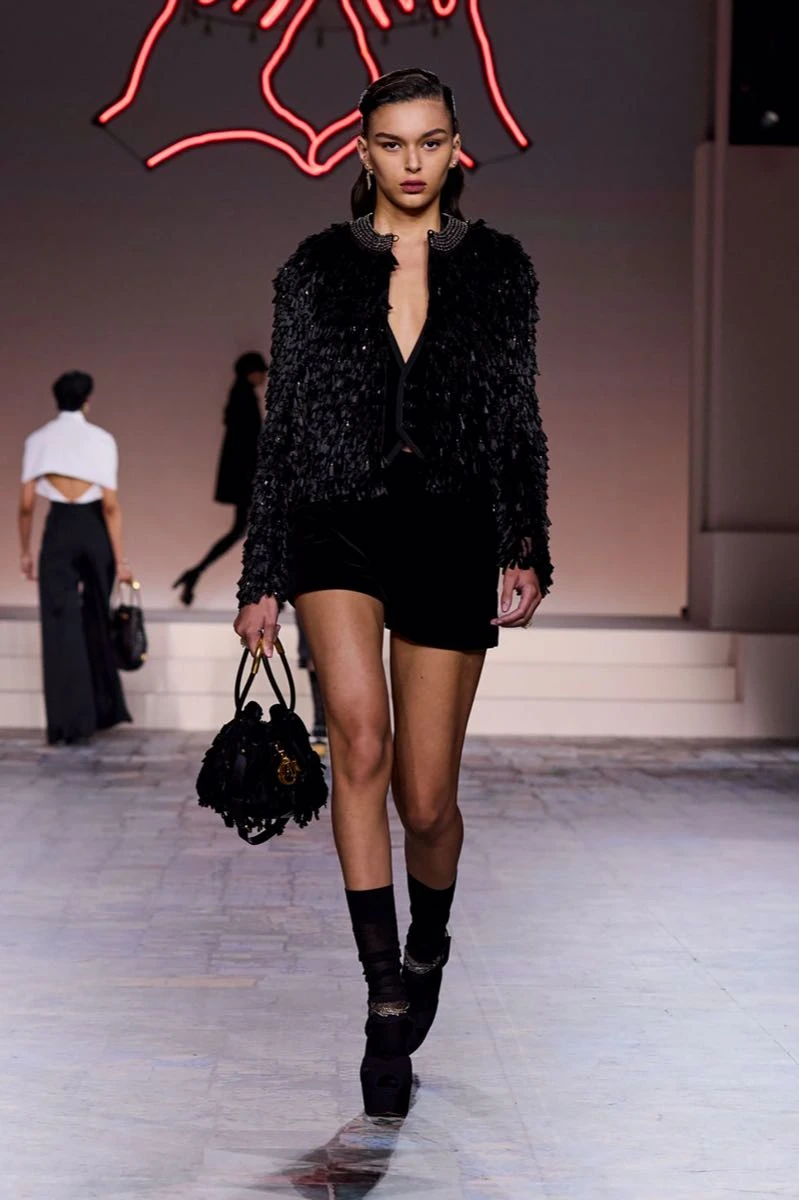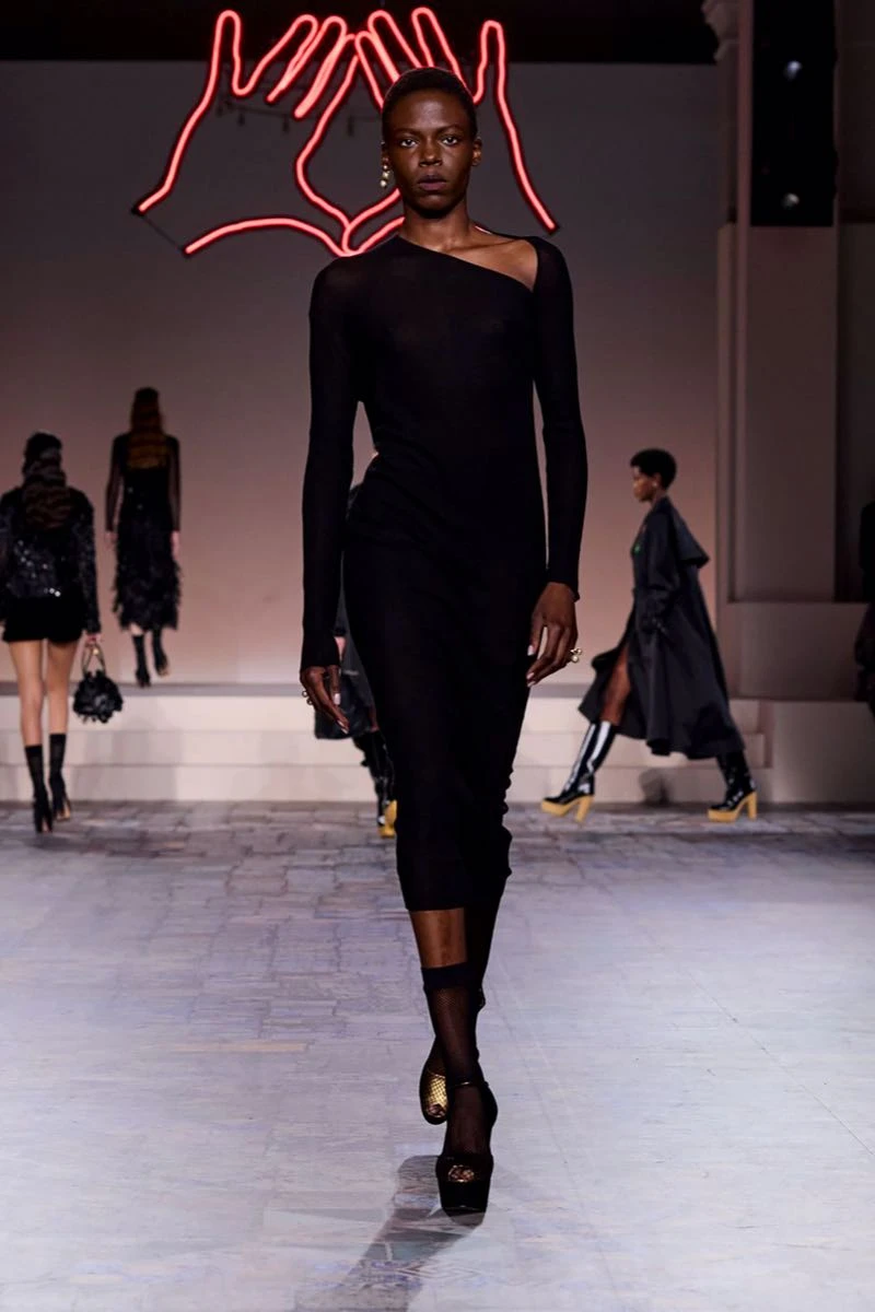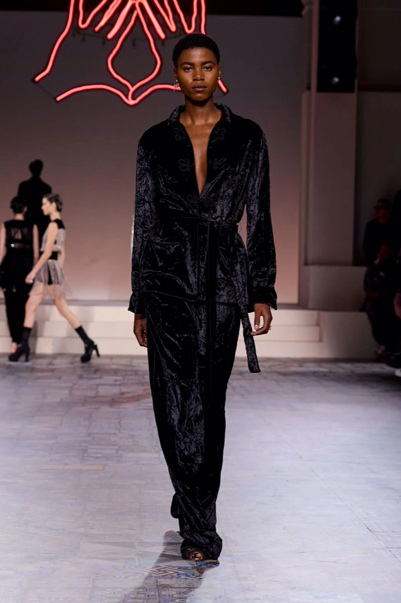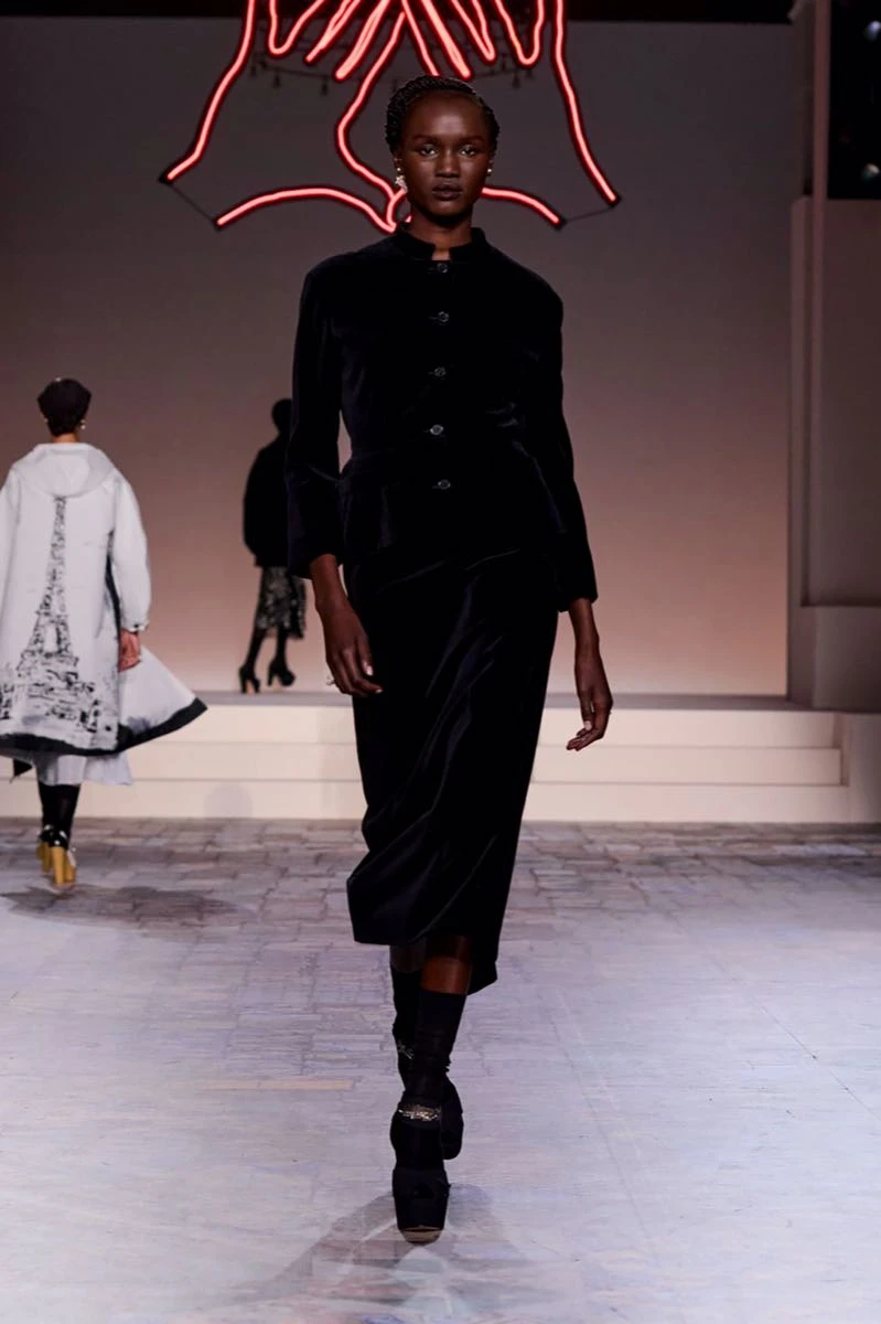 Se destacan los vestidos y chaquetas que se construyen de terciopelo negro brillante y esculpen una figura impecable.