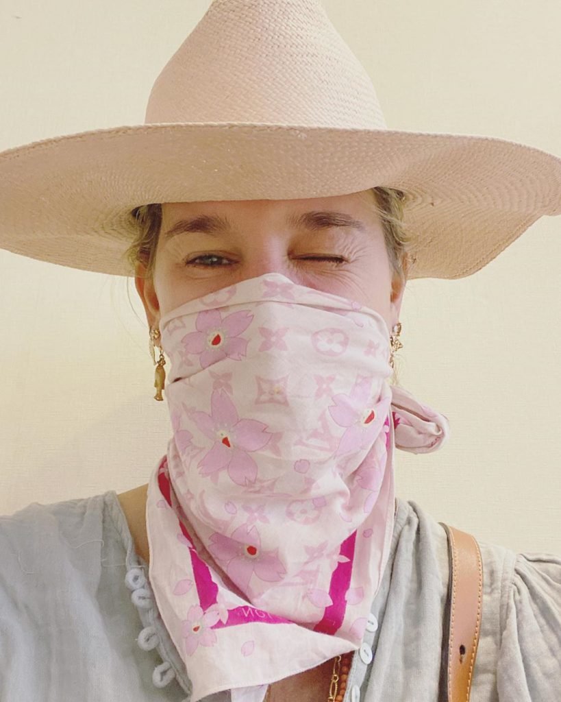 El detalle protector pero no por eso menos chic fue un pañuelo de seda puesto como una cowgirl y a modo de barbijo se seguridad.