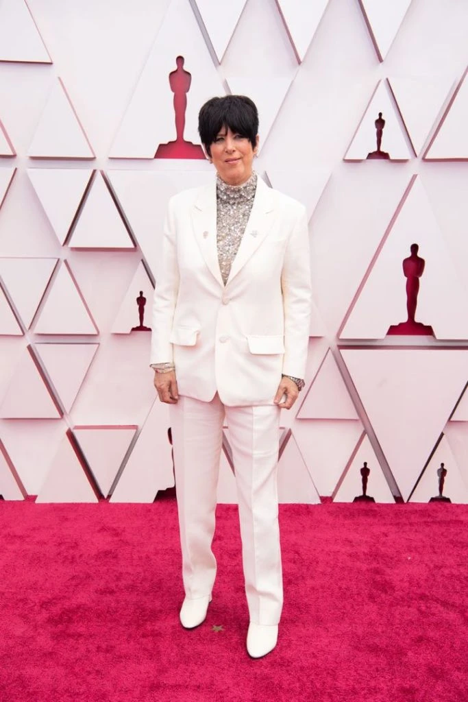Diane Warren eligió un traje blanco de Valentino, zapatos al tono y polera cubierta de lentejuelas, haciendo juego con los dos broches plateados de sus solapas.