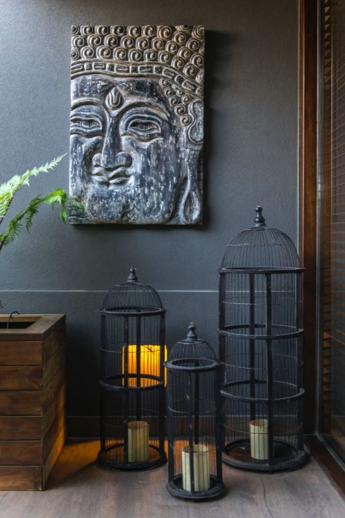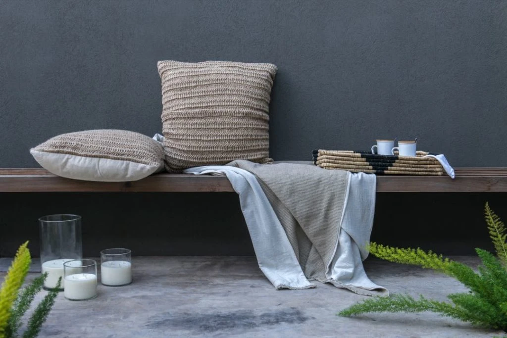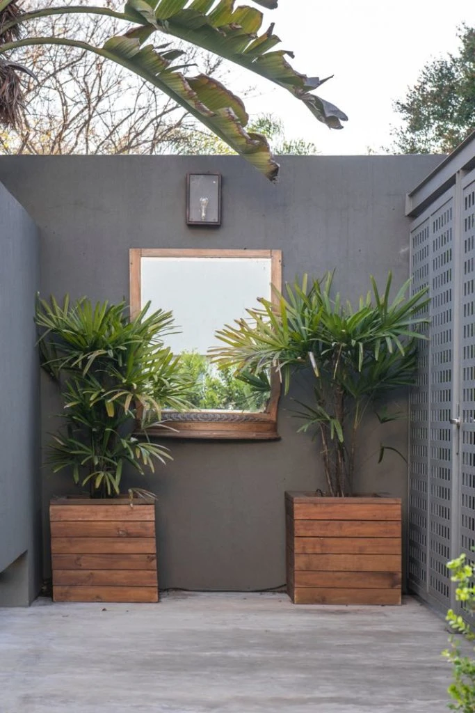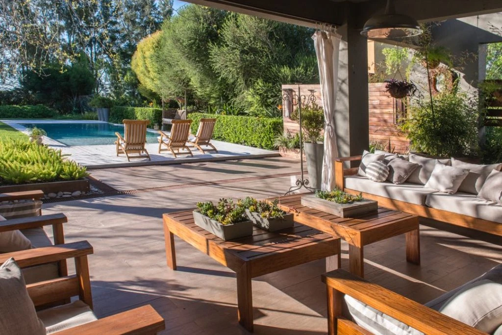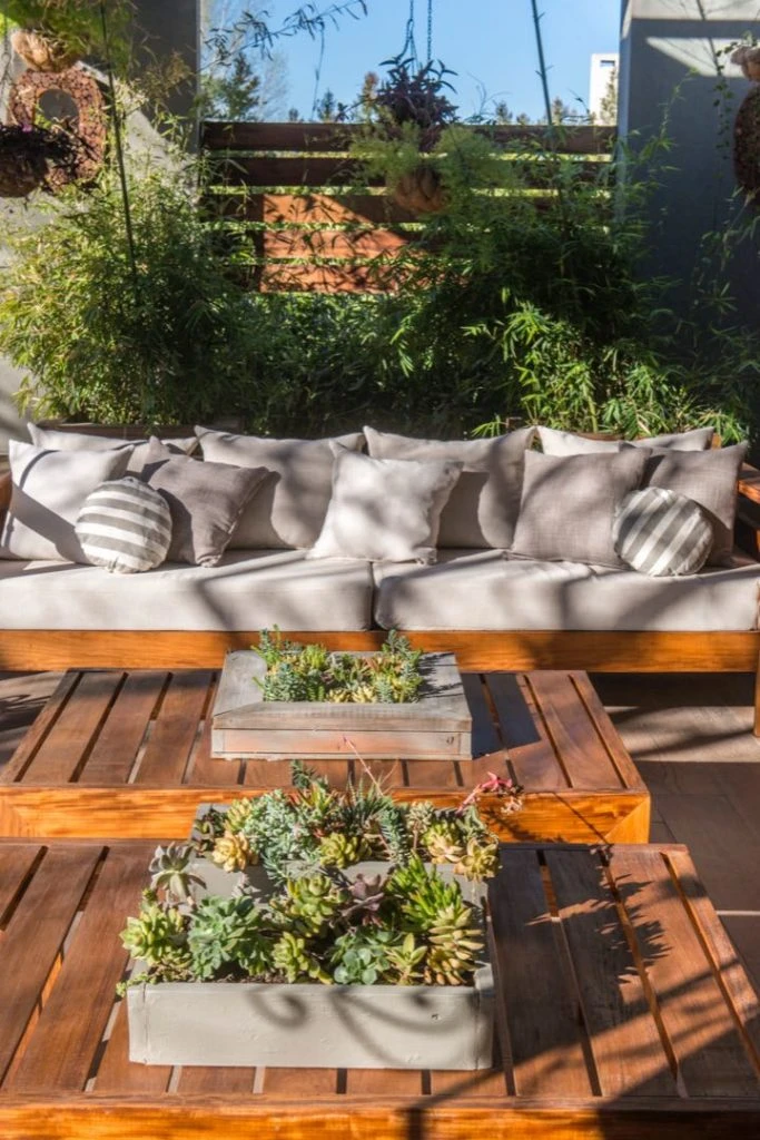 Y se destacan un banco de madera y macetas forradas en madera para acompañar el diseño general.