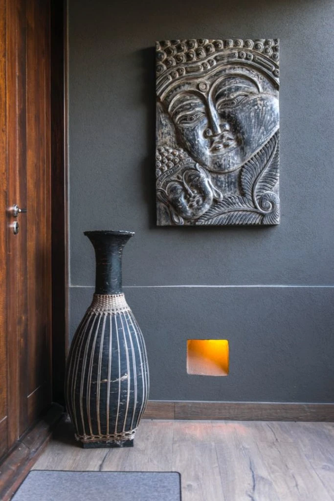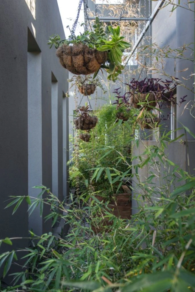 En un lateral de la casa, se armaron canteros con macetas de madera y cañas de bambú y, de manera aérea, se colocaron plantas colgantes generando una mini selva interior para las vistas de quien entra a la casa.