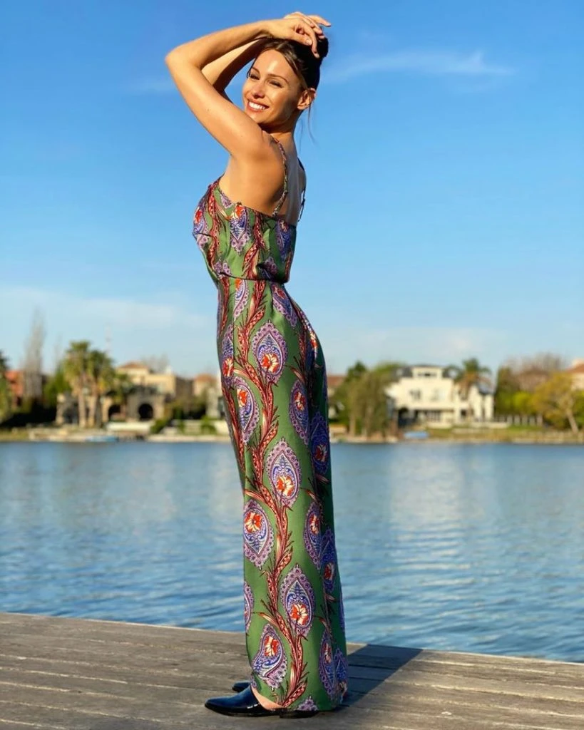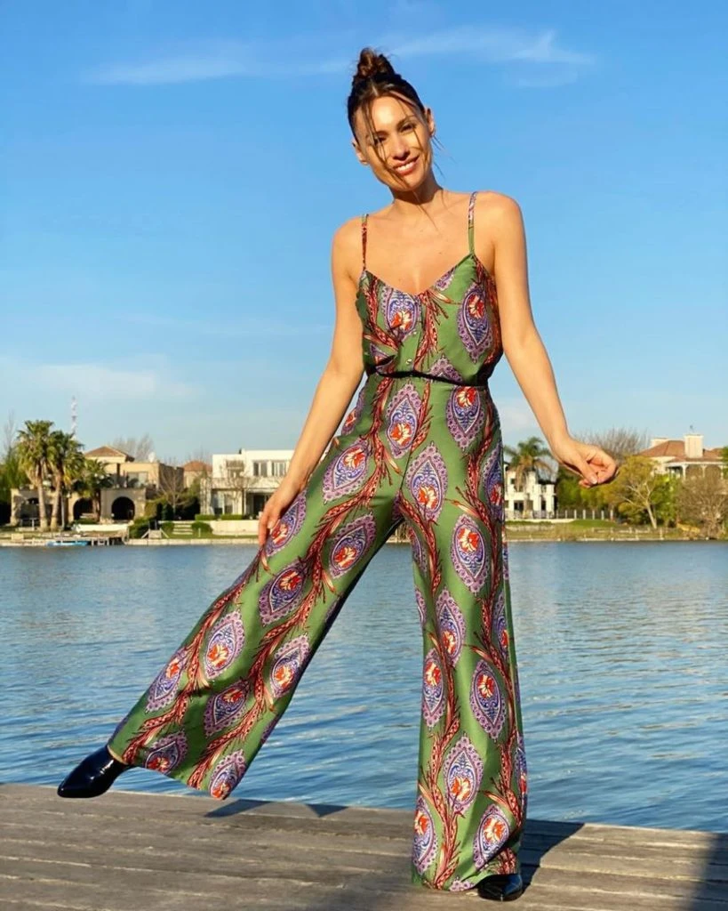 Pampita arrancó la primavera con un look que es súper tendencia: un mono estampado. De satén y con botones en el frente, es la prenda más hitera de la temporada.
