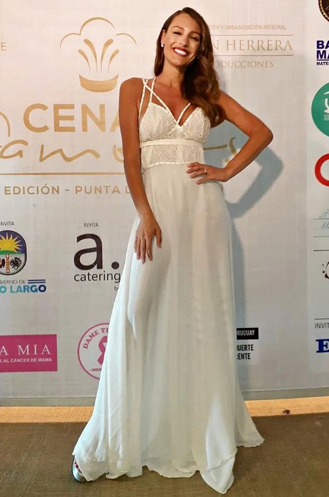 Pampita asistió al Centro de Convenciones de Punta del Este con un vestido largo blanco, ideal para una novia romántica. Se trató de un solero traslúcido, de corte griego, con espalda al descubierto, breteles finitos, y varias capas de gasa. Un diseño de Marcelo Giacobbe. ¡Divina!