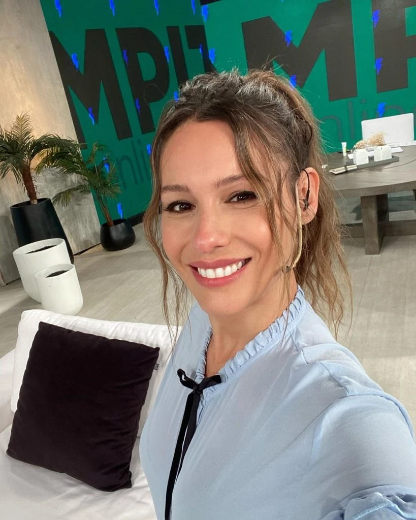 Con un look más clásico pero muy elegante, la periodista María Eugenia Ludueña, combinó su camisa con volados con un pantalón recto con bolsillos y stilettos de charol.