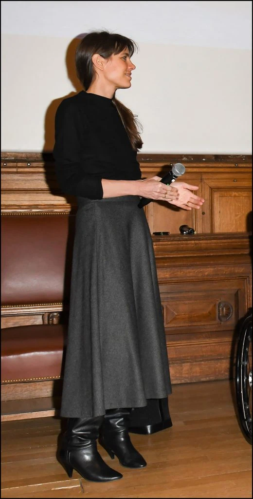 En tonos oscuros, usó una polera de manga larga –aunque la arremangó tipo tres cuarto- pollera midi ceñida en la cintura y con cierto vuelo a la altura de los tobillos. Bien invernal, y para el calzado llevó una de las tendencias de la temporada en Europa: botas altas tipo cowboy, con “efecto arrugado” y taco.