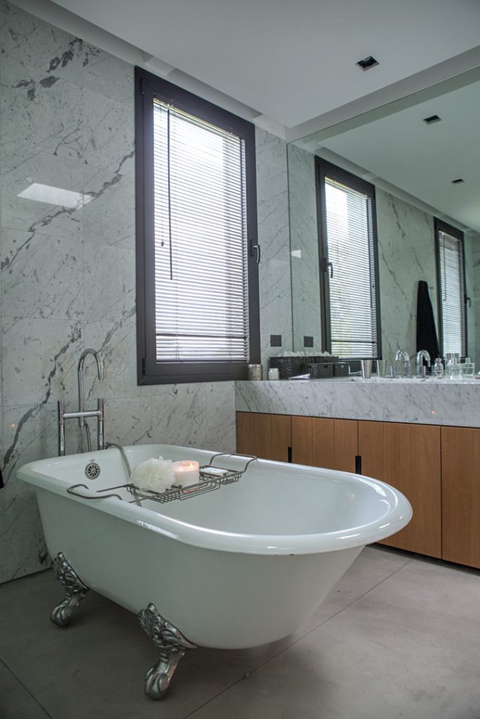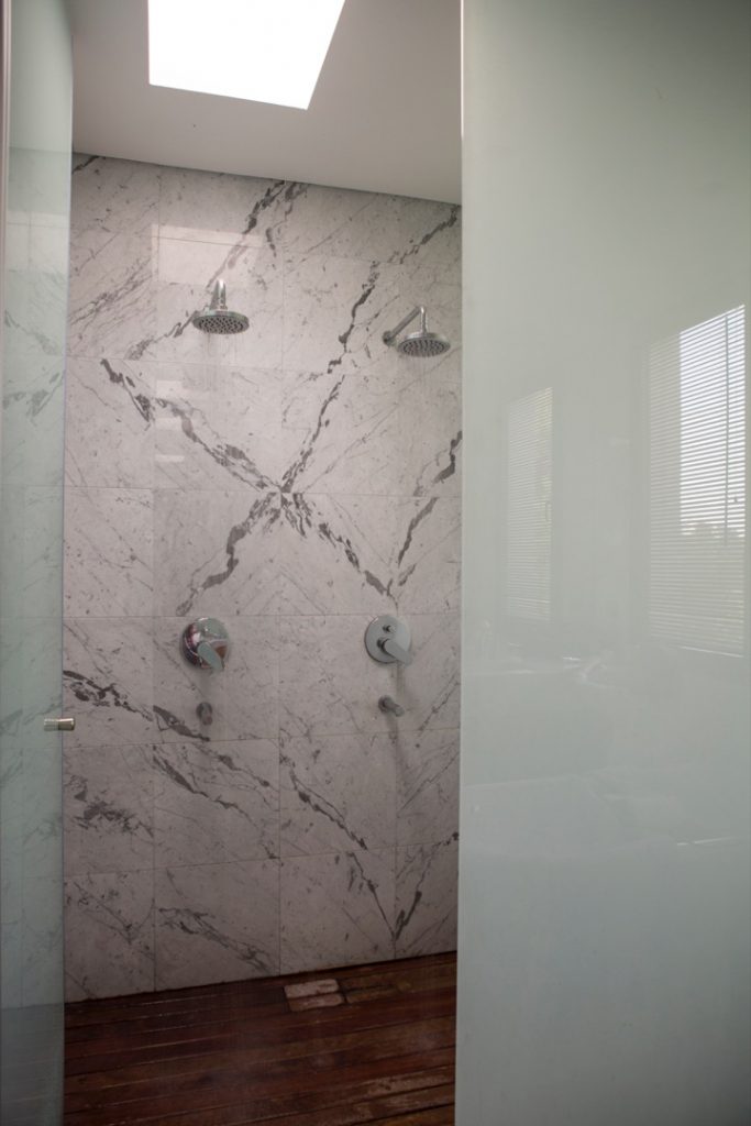 Paredes revestidas en mármol para el box de ducha.