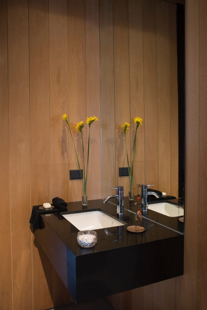 En la planta alta se ubican los dormitorios con sus baños en suite. El principal se acomoda en un espacio generoso, donde otra vez dominan las vistas. El arquitecto Martín Gomez diseñó un largo respaldo de cama de madera que se extiende de pared y pard y abraza a las mesas de luz, la cama y un escritorio para dos junto al ventanal, con lámparas Tolomeo (Iluminación Agüero) y sillas ergonómicas (Manifesto). Unos sillones celestes y una banqueta (Mulliere Padilla Deco) ofrecen un buen rincón para contemplar el paisaje. Los baños en suite y el toilette se amoldan al diseño moderno de la construcción, con grandes paños de mármol de Carrara y, en contraste, paredes forradas en madera.