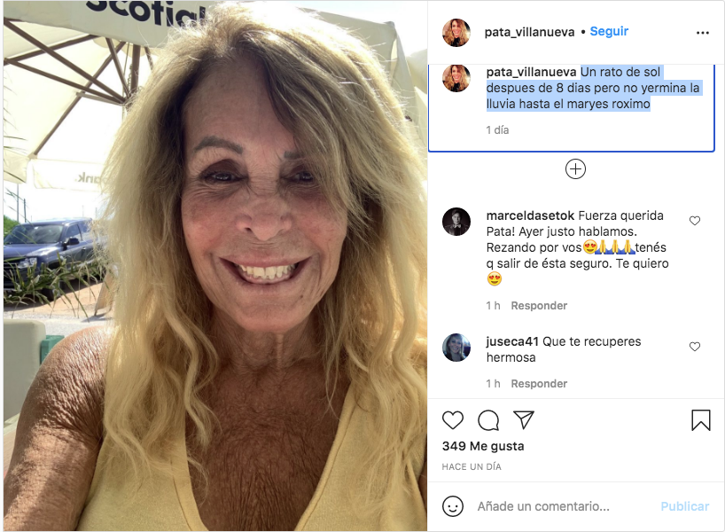 Apenas 24 horas antes del grave accidente, Pata había realizado una publicación en su cuenta de Instagram, al aire libre y haciendo un comentario acerca del clima. "Un rato de sol despues de 8 días pero no termina la lluvia hasta el martes próximo", escribió la exmodelo.