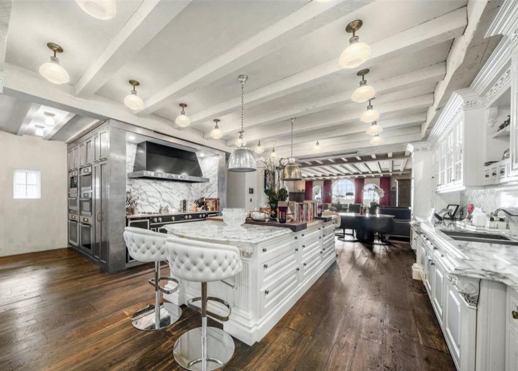 Muebles de madera laqueada brillante, banquetas en cuero capitoné, detalles cromo, mesadas de mármol: la cocina de la casa que acaba de vender Phil Collins tiene una cocina gourmet y de lujo. Una generosa isla central con espacio a modo de desayunador, marca el centro de la escena.