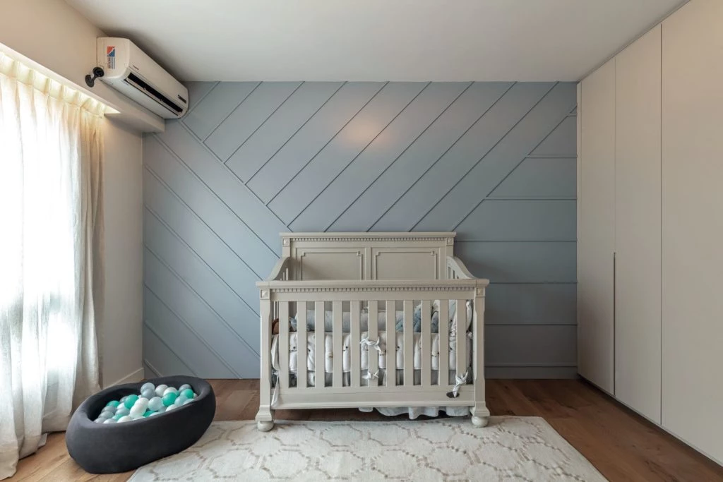En el dormitorio del bebé, la original cuna apoya contra una pared revestida con varillas diagonales que se entrecruzan formando un diseño. Predomina una paleta de colores muy relajada así como también una decoración súper simple y delicada.
