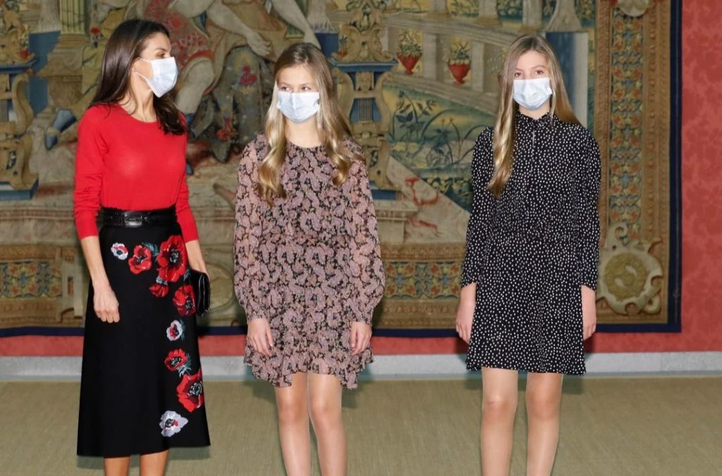 Letizia se lookeó con un jersey rojo que combinó con la falda con flores XXL en 3D sobre fondo negro de Carolina Herrera que ya ha usado en varias oportunidades.