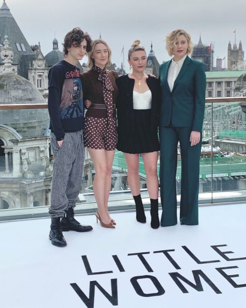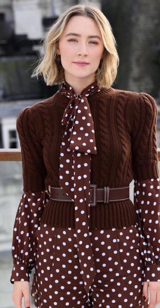 Si bien hay diferencias entre los dos outfit, el parecido es notable. Sobre la blusa con lazo, Saoirse lleva un chaleco tejido con trenzas. Todo el look de Ronan está firmado por Michael Kors.