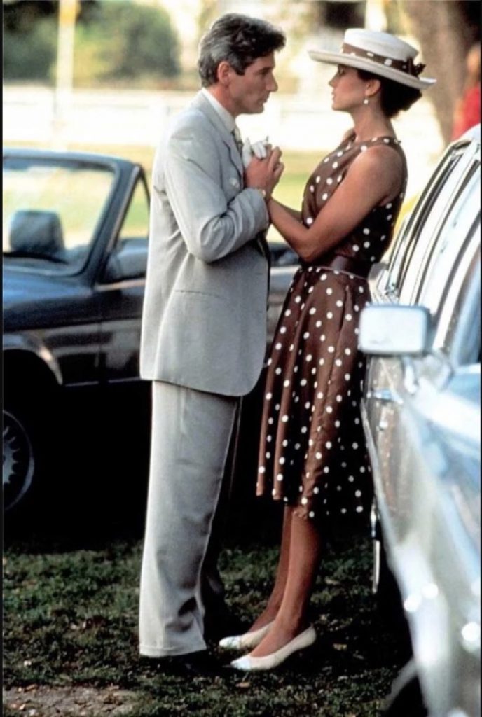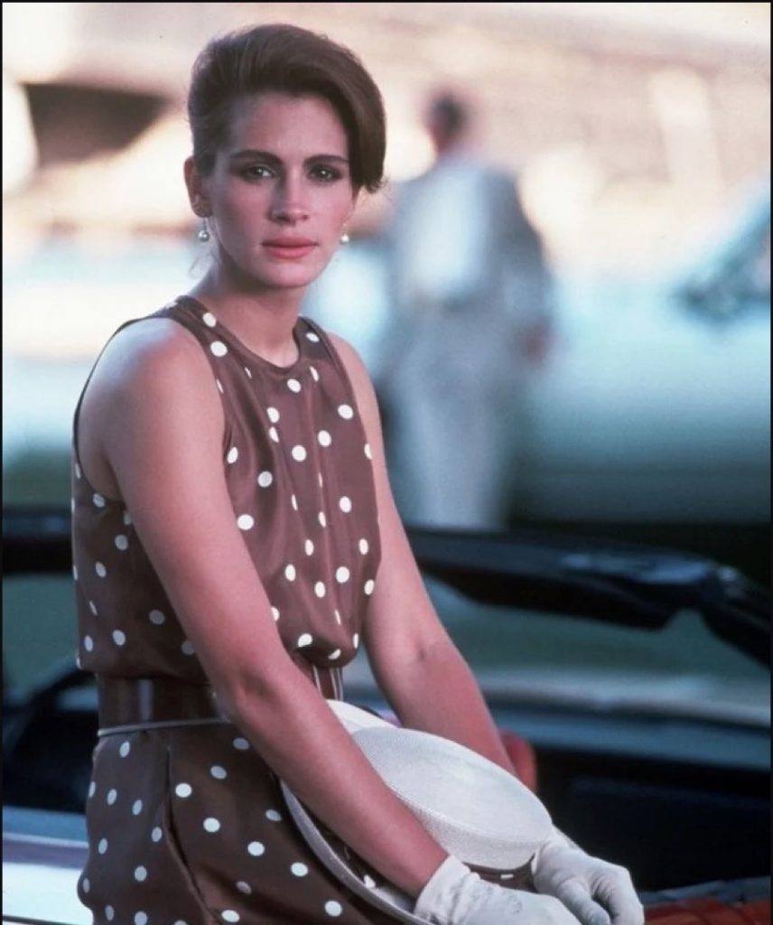 Julia Roberts en "Mujer Bonita" usa un vestido a lunares de color similar al de Ronan, pero las dos coinciden en que le sumaron un cinturón ancho. La actriz de "Mujercitas" completó el look con stilettos en color camel.