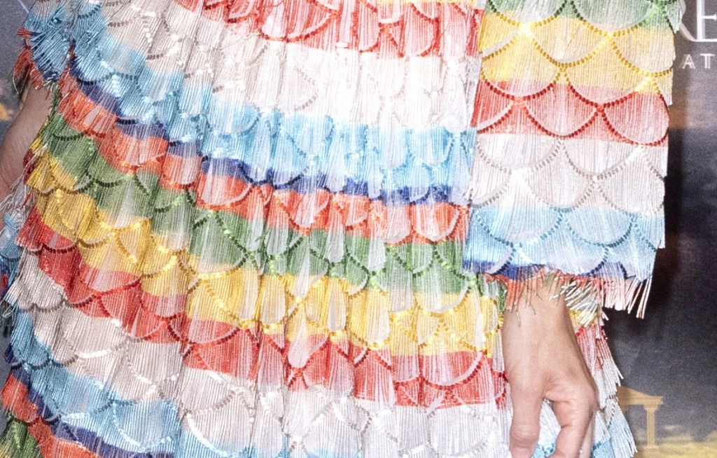 Apenas pisó la red carpet los flashes se rindieron ante su encanto. La modelo llevó un maxi vestido multicolor confeccionado en un genero muy particular. A la vez que simula escamas de pescado, el color del género lo aportan pequeños flecos que le dan movimiento y fluidez.