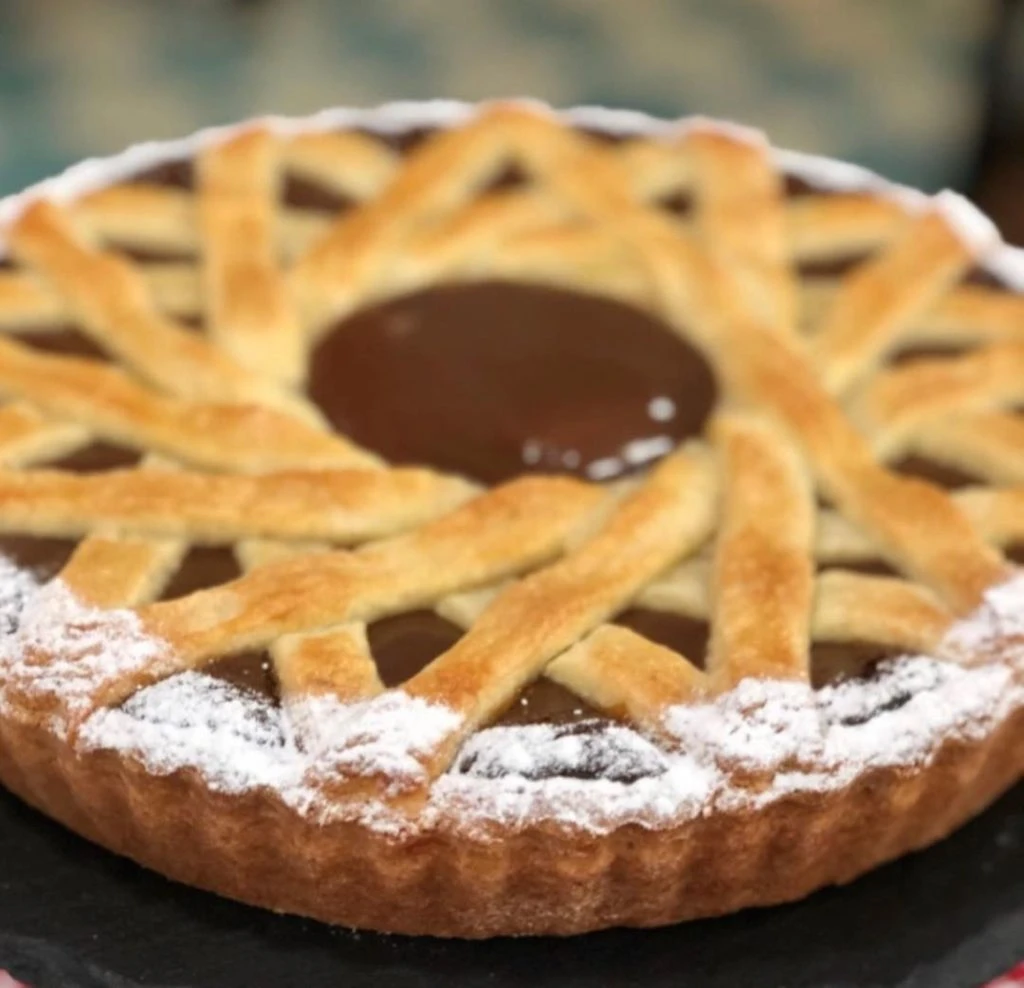 Retirar del dfrío. Reservar un tercio y estirar. Colocar en un molde de tarta rizado. Colocar el dulce de leche en una manga y rellenar la tarta. Estirar el tercio de masa restante y formar tiras. Colocar las tiras intercaladas con un cintura de metal o algún recipiente para dar forma e intercalar las tiras sobre el dulce. Pintar con huevo.
