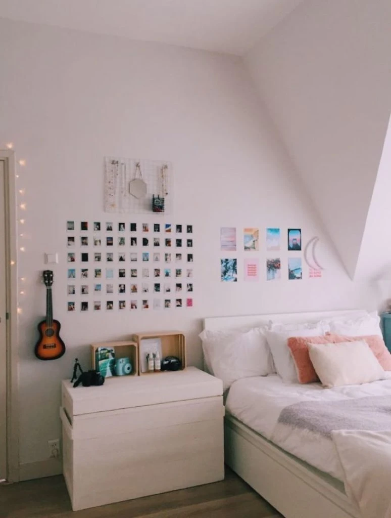 Decorar las paredes con decenas de fotos es un must del estilo aesthetic. Algunos las lucen estilo guirnalda, colgadas en por tiras de luces. Otros prefieren imprimir dibujos, imágenes artísticas que sacan de Pinterest o fotos de las tapas de sus discos favoritos. Cuántas más juntes, mejor.