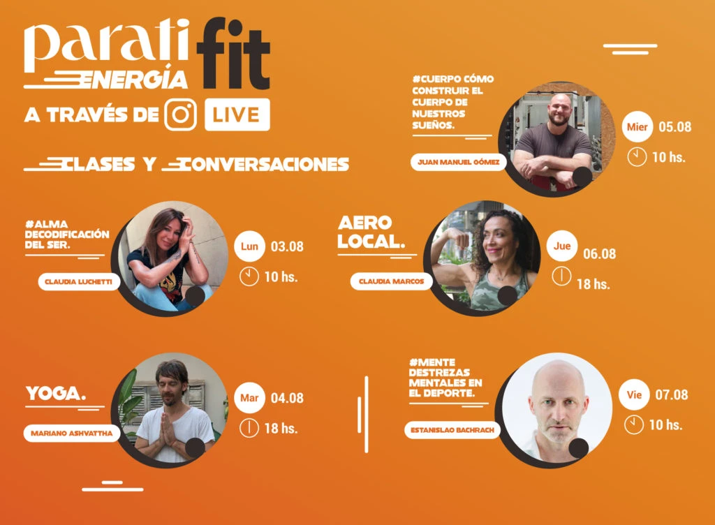 En Instagram (@paratirevista), el ciclo Energía Para Ti que comenzó con la cuarentena se pone 100 % fit, con 5 IG Live: conversaciones (lunes, miércoles y viernes), con Claudia Luchetti, Juan Manuel Gómez y Estanislao Bachrach, respectivamente. Y clases en vivo (martes y jueves) para hacer en casa: yoga junto a Mariano Ashvattha y aero local de la mano de Claudia Marcos.