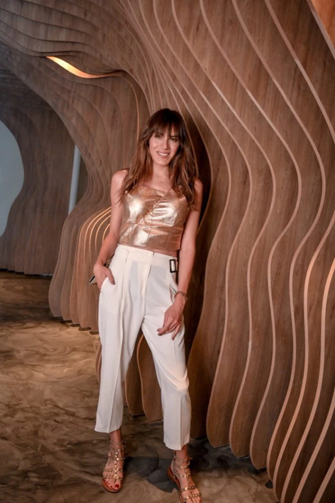 La actriz Mariana Genesio Peña en la apertura del nuevo restaurante Fabric Nikkei Sushi Bar, sobre el Dique 4, en el corazón de Puerto Madero. Muy canchera, eligió un top de cuero metalizado (hit de temporada) y lo combinó con un pantalón de cintura alta color nude. Más ojotas griegas metalizadas con tachas: el toque chic. ¡Bien x ella!