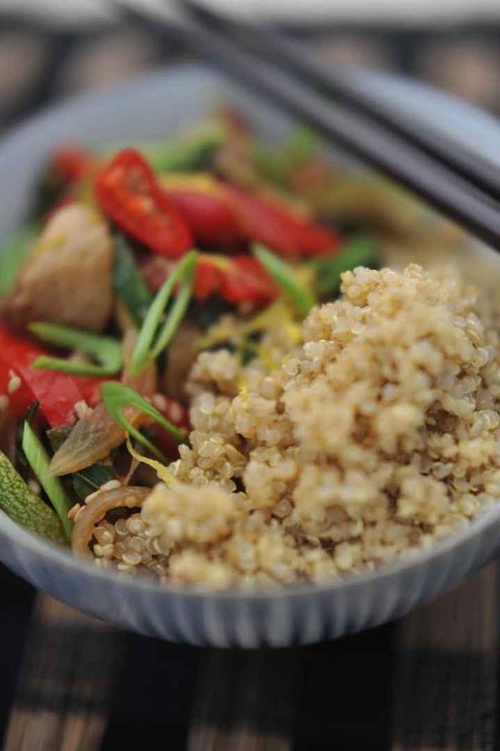 - En la misma sartén dorá la cebolla, el morrón, el zucchini y el puerro. Luego agregale el ajo. Después de un minuto levantá el fondo de cocción con la salsa de soja, la salsa teriaki y el jugo del limón. Agregale el jengibre y mezclá bien. Si querés podés incorporar la quínoa o servirla directamente por separado. Rectificar los sabores. Decorá con las semillas molidas, un poco de piel de limón y si te quedó un poco de puerro fileteado.