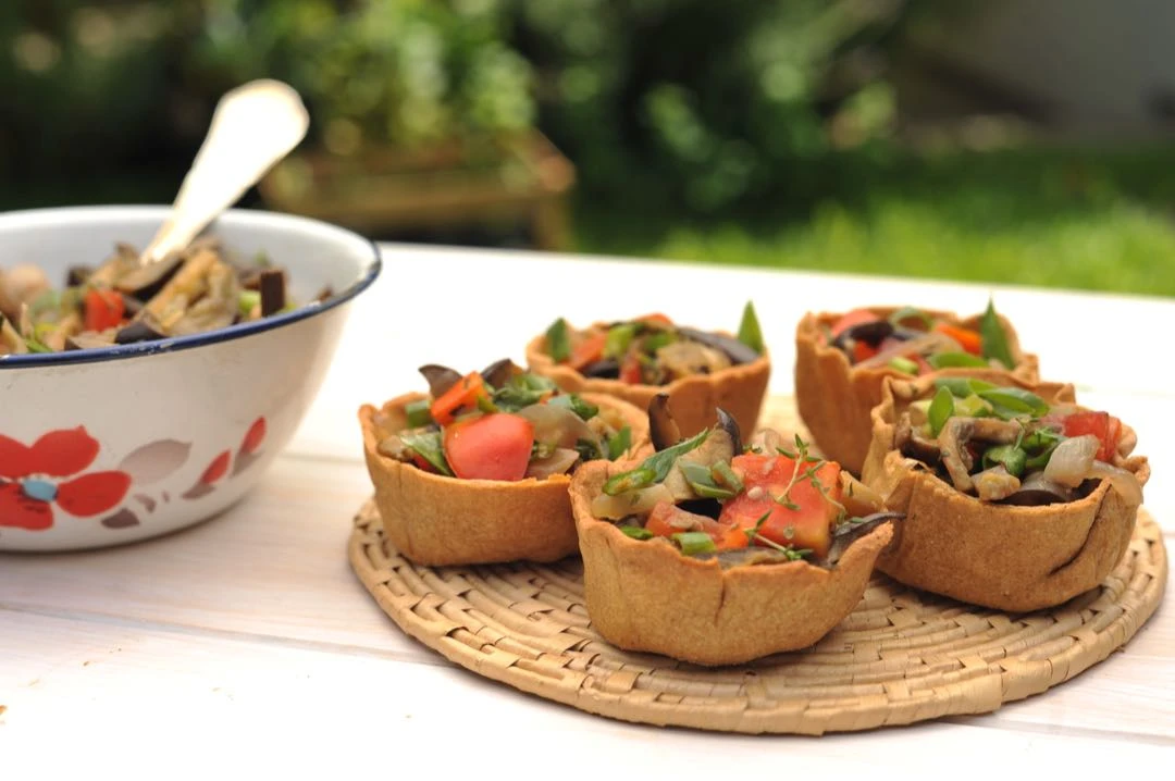 - Poner un poco de relleno en cada disco de masa y formar las canastitas o llevarlas a moldes para canastitas.