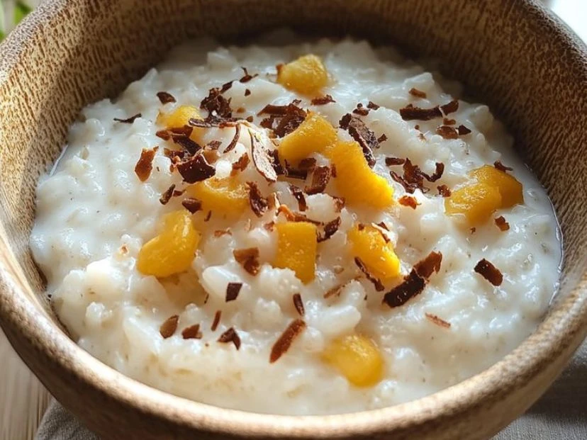 El arroz con leche es uno de esos postres de siempre que todos conocemos, pero esta versión con leche de coco lo transforma en algo completamente distinto. Cremoso, delicado y con un perfume especial, se corona con mango fresco y coco tostado para sumar frescura y crocancia. Es ideal como postre veraniego, pero también se disfruta tibio en los días frescos.