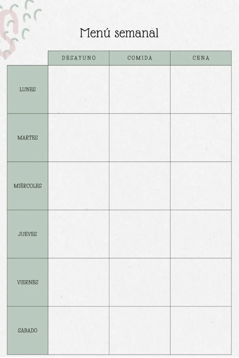 Por el medio en el que te parezca más cómodo, vas a armar un menú que se distribuirá en 5 columnas con los 5 días de la semana y en 3 filas: desayuno, almuerzo y cena.