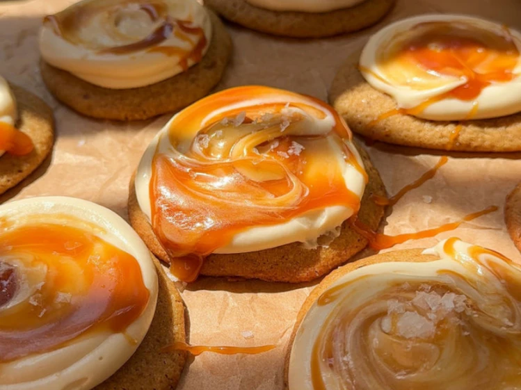Paso 9: Una vez frías las cookies, agregá el frosting por encima y terminá con hilos de dulce de leche para decorar.