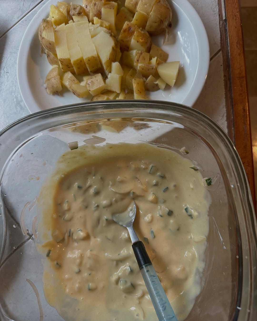 -Como no tenía pepinos encurtidos hice lo del vinagre hervido; si tienen, omitan ese paso y usen un poco del líquido también para aderezar un rato antes de agregar la papa así la cebolla se va ablandando.