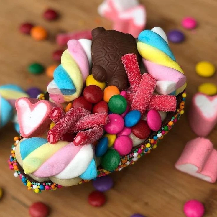 A diferencia del huevo tradicional, esta versión apuesta a lo exagerado: capas de chocolate, rellenos cremosos y una mezcla de confites, gomitas y marshmallows que lo convierten en una verdadera bomba dulce.