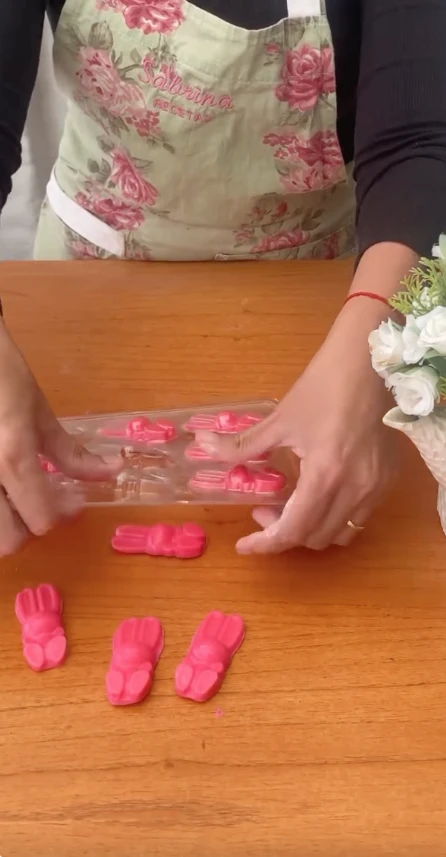 - Paso 3: Para el huevo plano, limpiá el molde y agregar chocolate blanco derretido y luego agregale los apliques. Dejá solidificar y desmoldás.