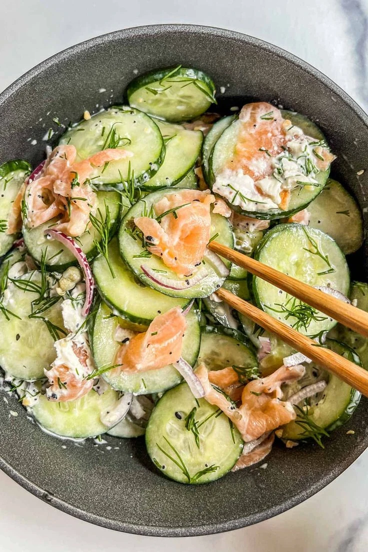 - Paso 1: Cortá el pepino en rodajas muy finas, todas del mismo tamaño. Colocalo en un bowl.