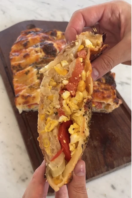 Calzone relleno con cebolla, choclo, tomate y queso a la napolitana