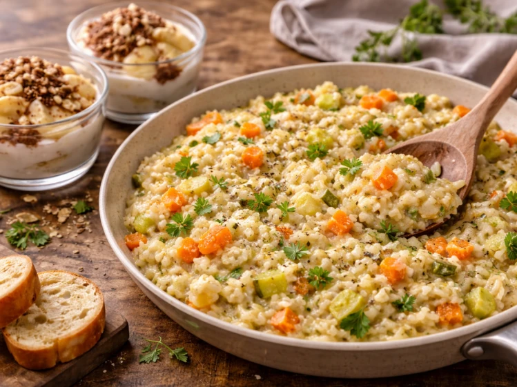 - Plato principal: Arroz cremoso con verduras y queso (tipo risotto rápido)