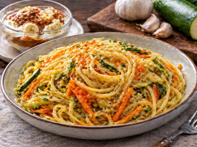- Plato principal: Fideos salteados con manteca, ajo y vegetales crocantes